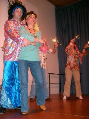 Auftritt des Laienspielkreises als die" ORIGINAL OBERBARMER" im Outfit einer Trachtengruppe mit original "Lederhosen" aus Schrubtüchern genäht ![]() |